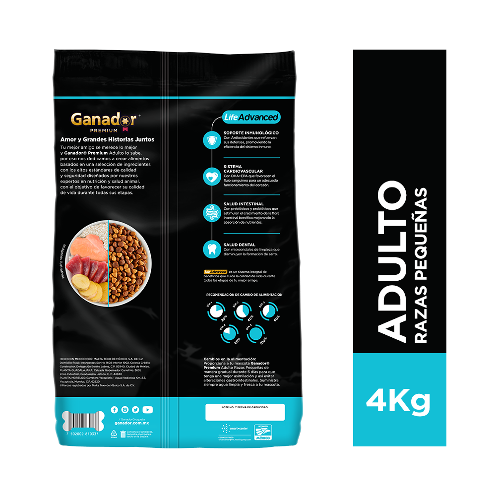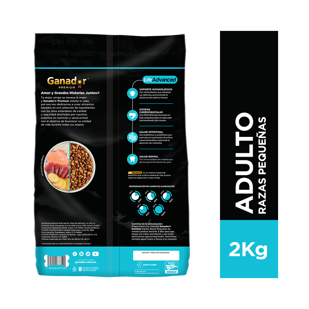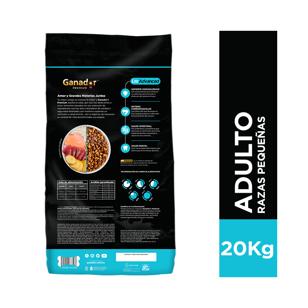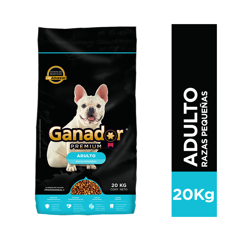 Las croquetas para perro Ganador son de alta calidad profesional para razas pequeñas con beneficios específicos para cubrir sus necesidades: Omegas 3 y 6 que ayudan a mantener su piel y el pelo saludables con el balance ideal de estos ácidos grasos esenciales, probióticos y prebióticos que sirven para fortalecer el sistema inmunológico ayudando a prevenir las enfermedades, tamaño Ideal para perros de raza pequeñas, salud bucal para ayudar a disminuir la formación de sarro y complejo SI+ esencial para promover la salud intestinal.