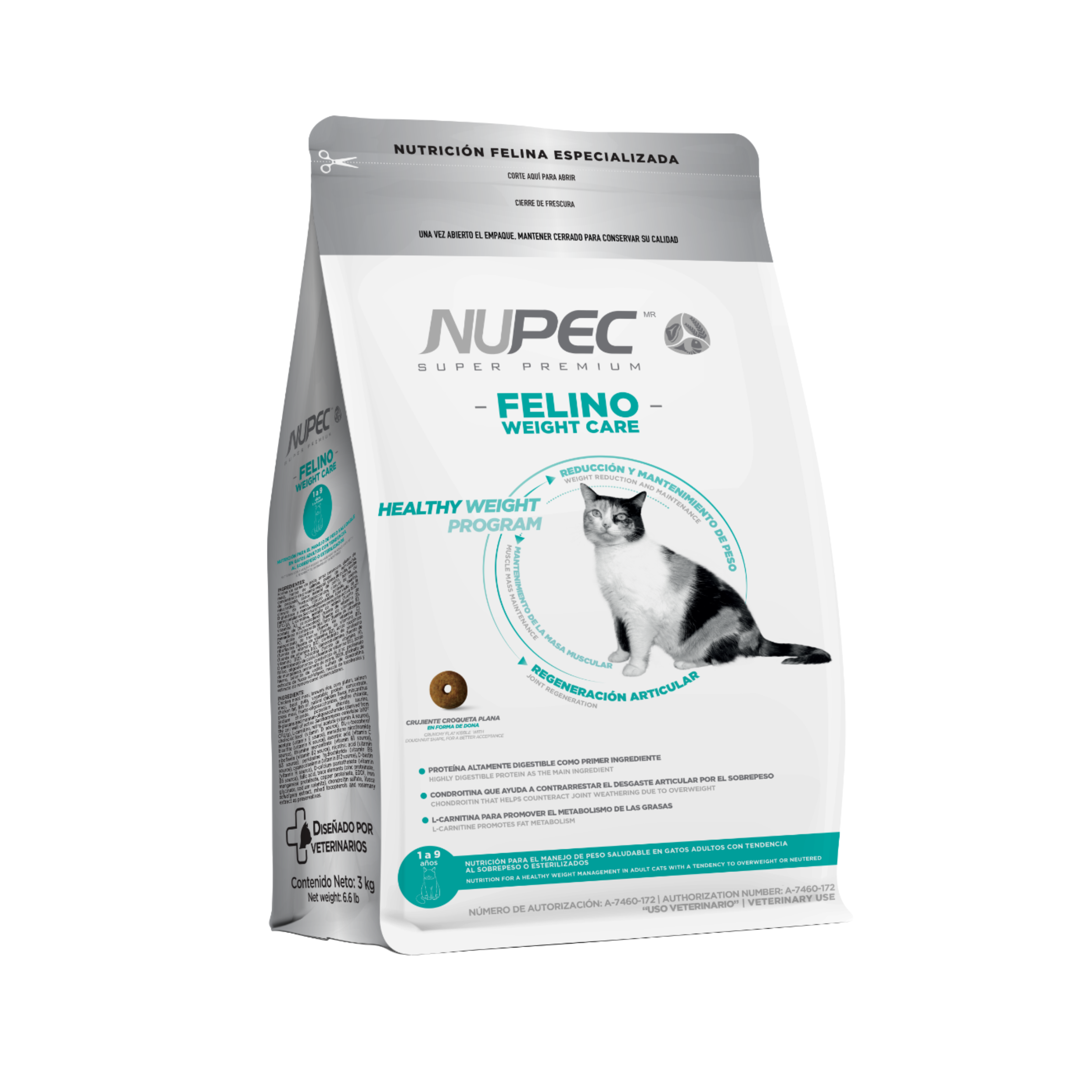 El sedentarismo, la sobrealimentación y la esterilización predisponen a los gatos al sobrepeso. Por ello, NUPECMR FELINO WEIGHT CARE en un alimento formulado un producto que ayuda a tu gato alcanzar y mantener su peso ideal, por medio de una sana alimentación.