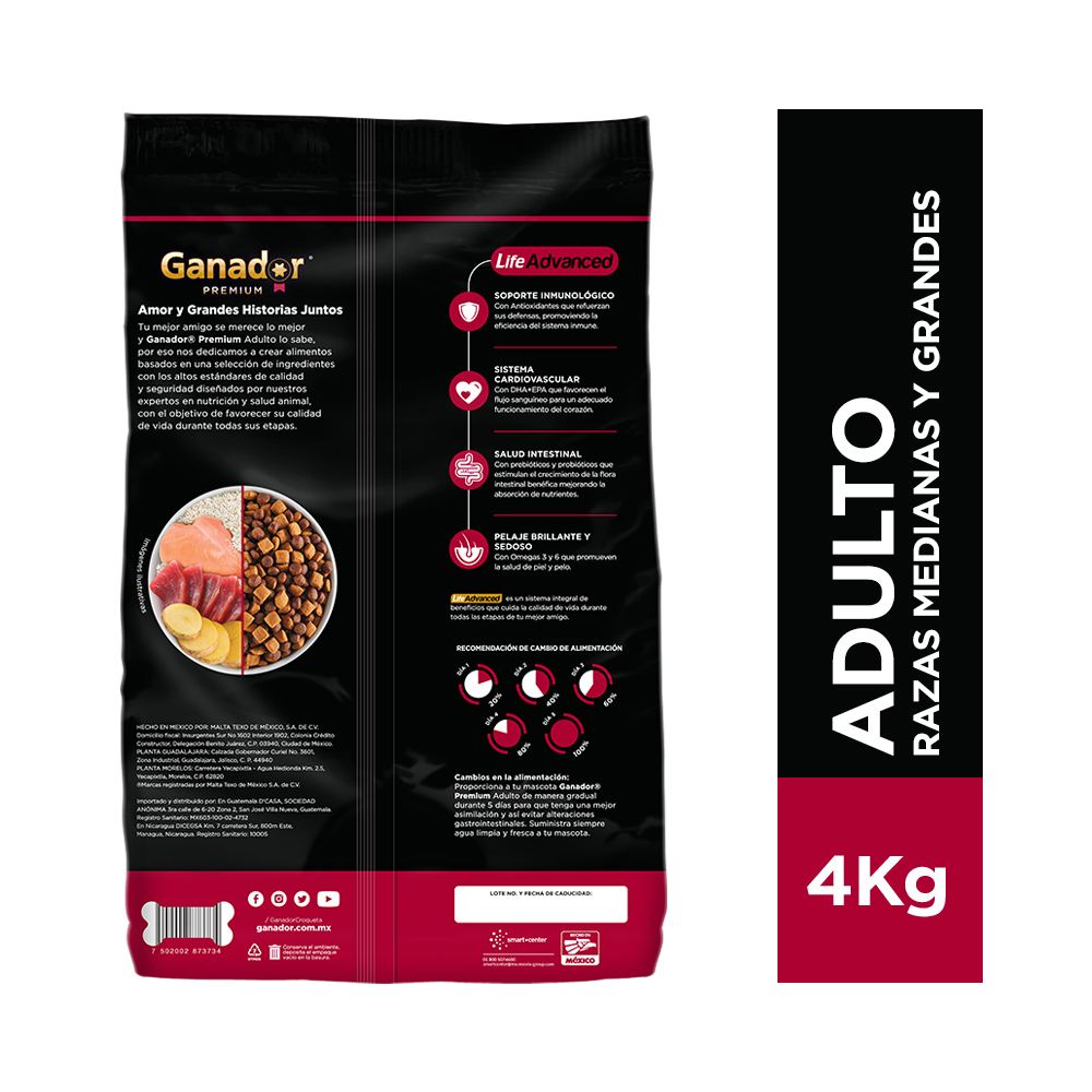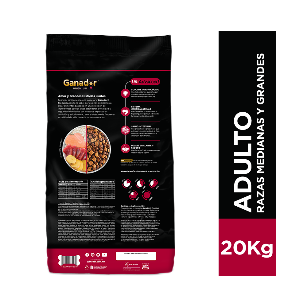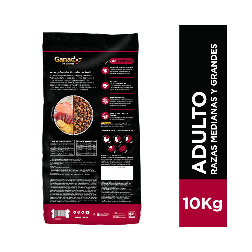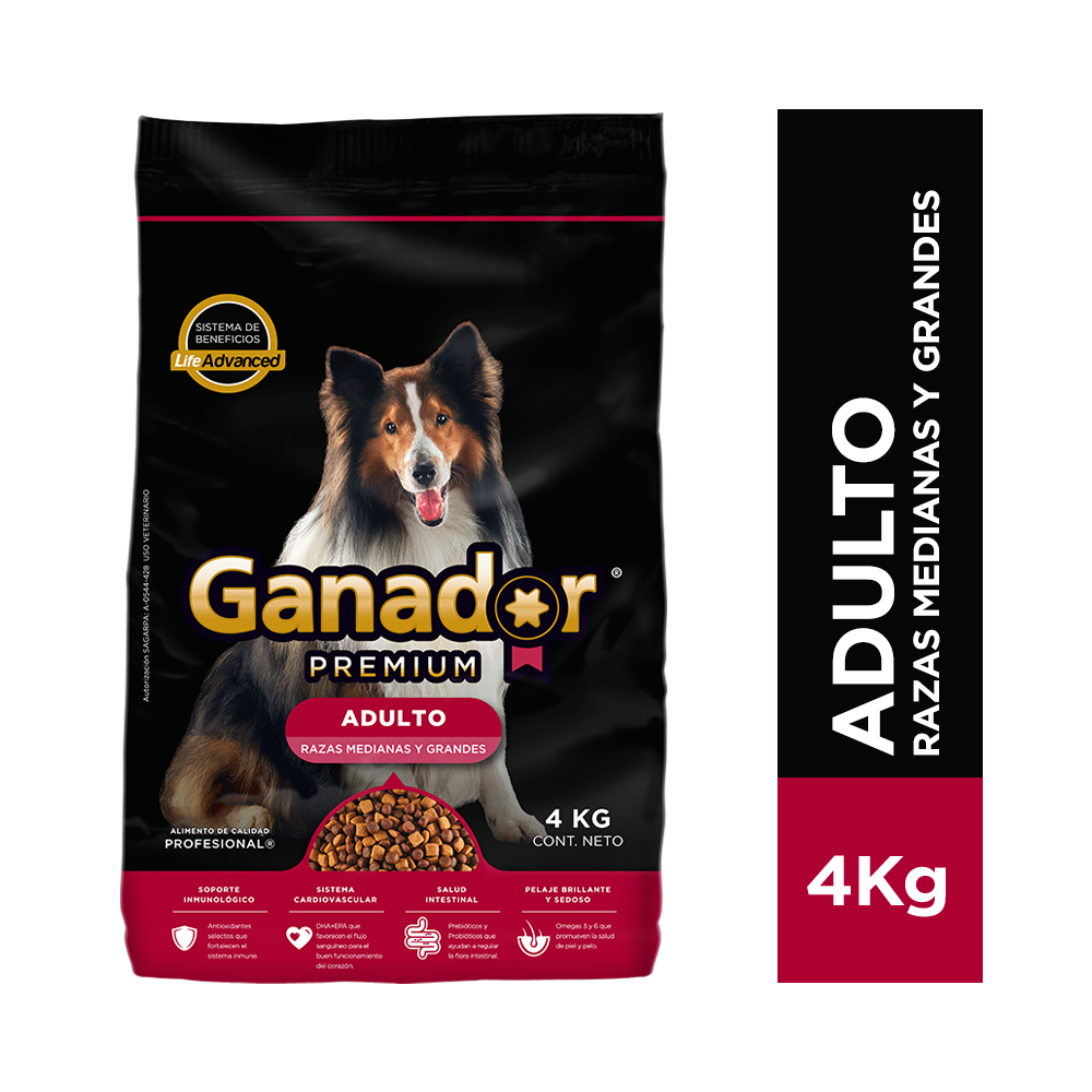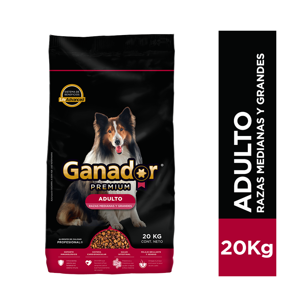 El alimento para perro Ganador Premium está elaborado con una variada selección de ingredientes que les brindan a tus mascotas toda la nutrición que necesitan para estar sanas. Contiene antioxidantes que ayudan a fortalecer sus defensas, y lactobacilos que mejoran su digestión. El consumo de alimento Ganador Premium hará que tus mascotas aumenten la producción de glóbulos blancos necesarios para protegerse de enfermedades cardiovasculares y del envejecimiento.