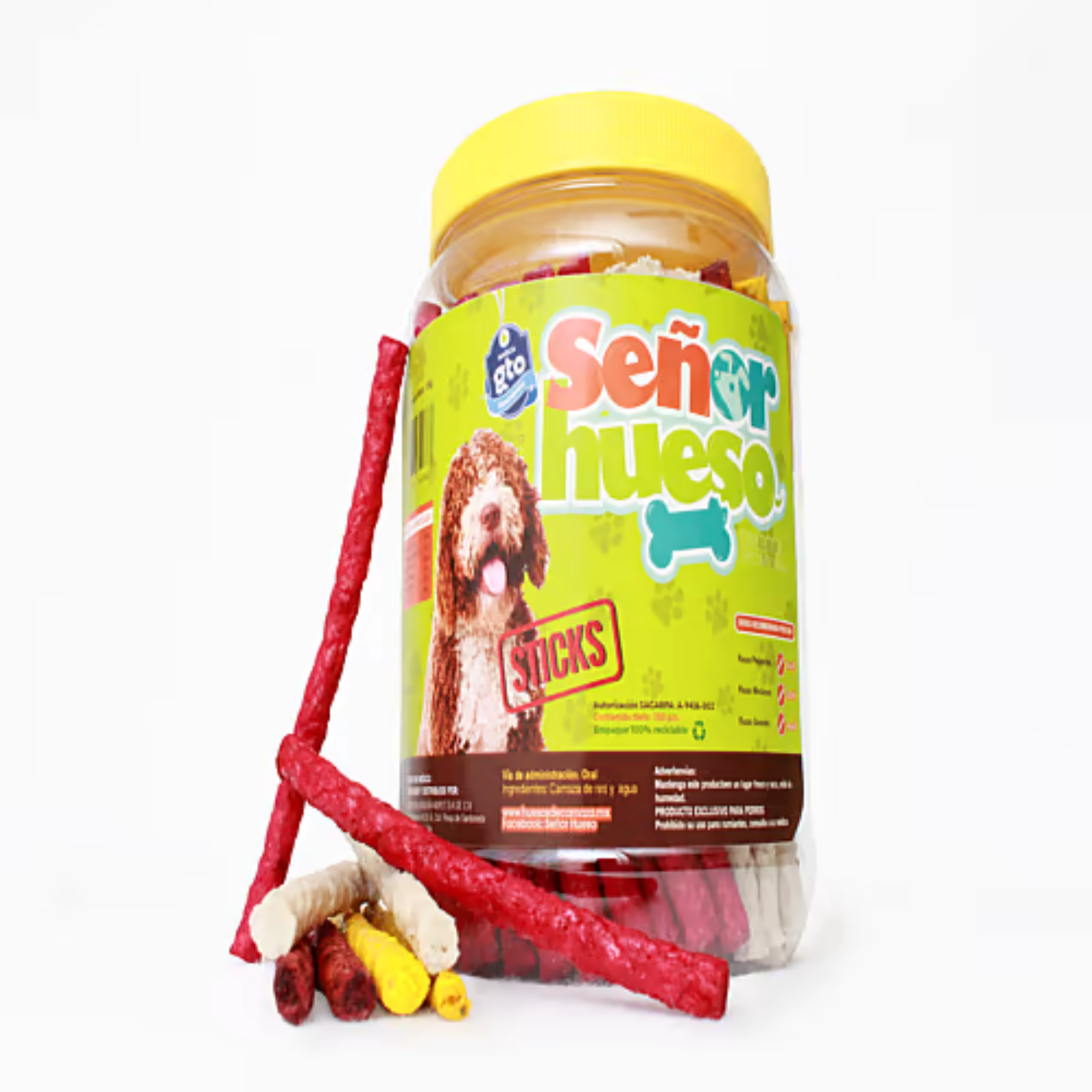 SEÑOR HUESO Vitrolero Carnaza Triturada Sticks. Estos divertidos palitos de carnaza natural triturada ayudarán a fortalecer las encías de tu amigo perro, además contribuye a la limpieza de sus dientes y sobre todo lo mantiene ocupado satisfaciendo su necesidad de morder