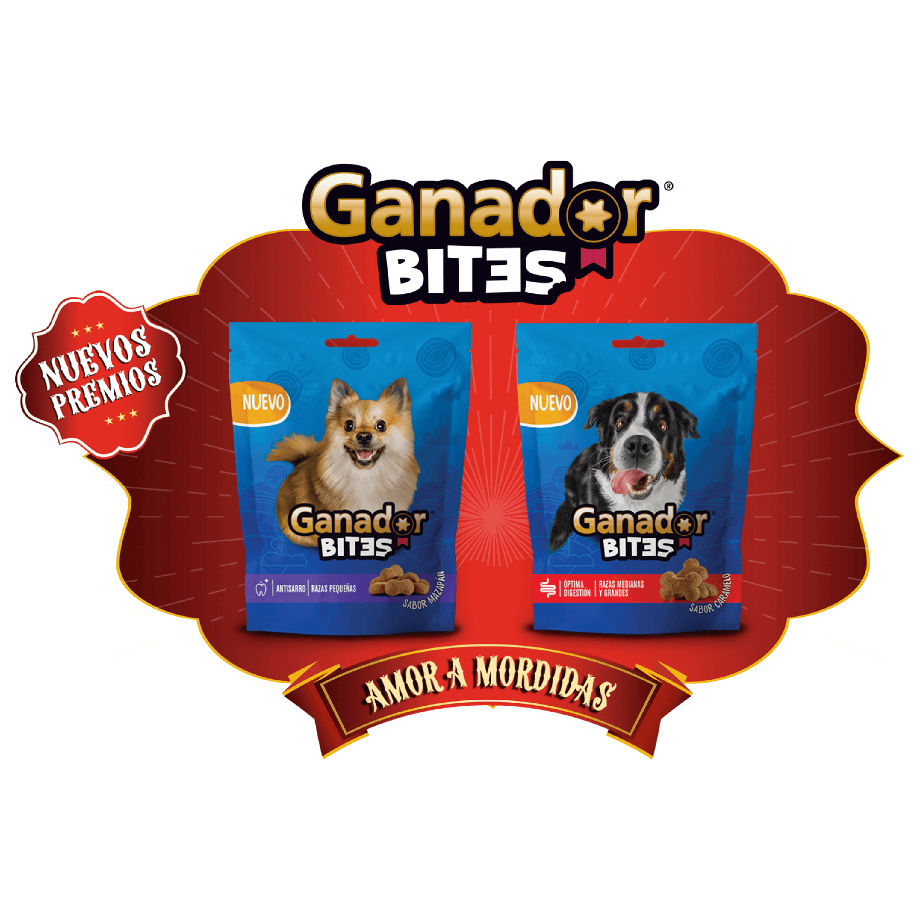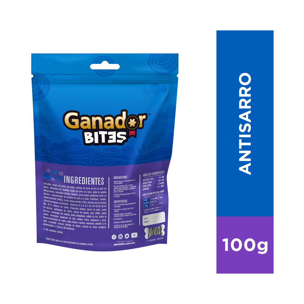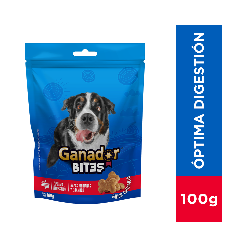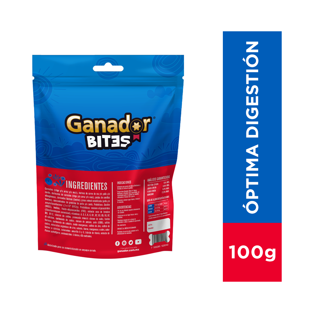 Nota: 1 Pieza de Ganador® Bites Razas medianas y grandes equivale de 2.5 a 6 g aproximadamente.