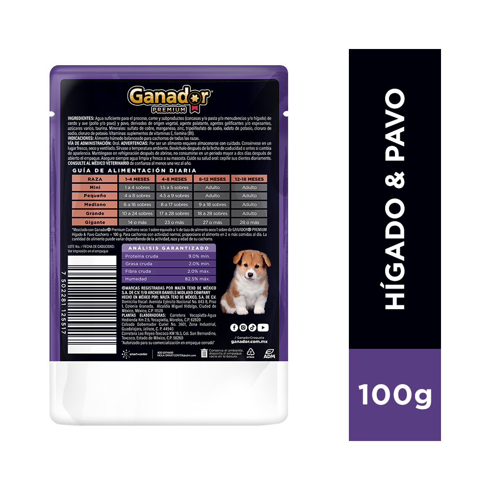 Agua suficiente para el proceso, carne y subproductos (carcasas y/o pasta y/o menudencias y/o hígado) de cerdo y ave (pollo y/o pavo) y pollo, derivados de origen vegetal, agente palatante, agentes gelificantes y/o espesantes, azúcares varios, taurina. Minerales: sulfato de cobre, manganeso, zinc, tripolifosfato de sodio, iodato de potasio, cloruro de sodio, cloruro de potasio. Vitaminas: suplementos de vitaminas E, tiamina (B1).