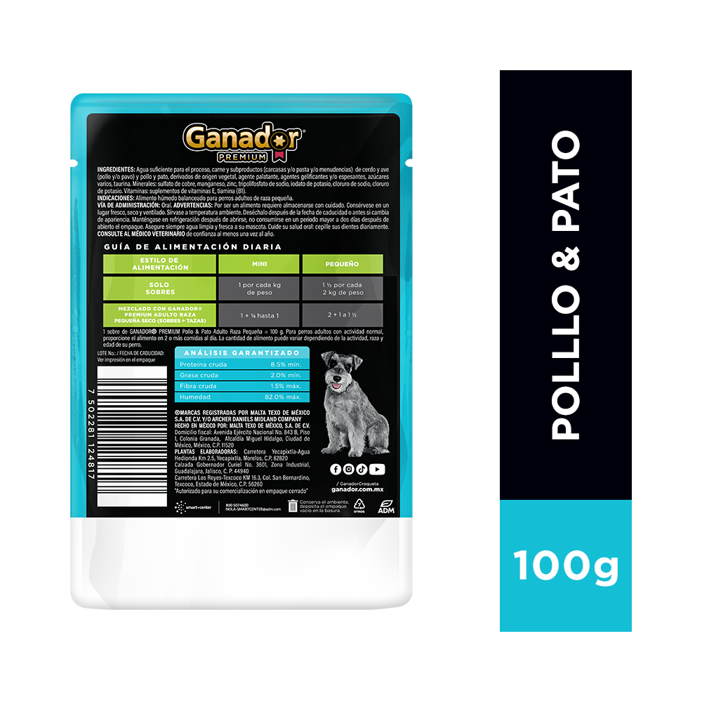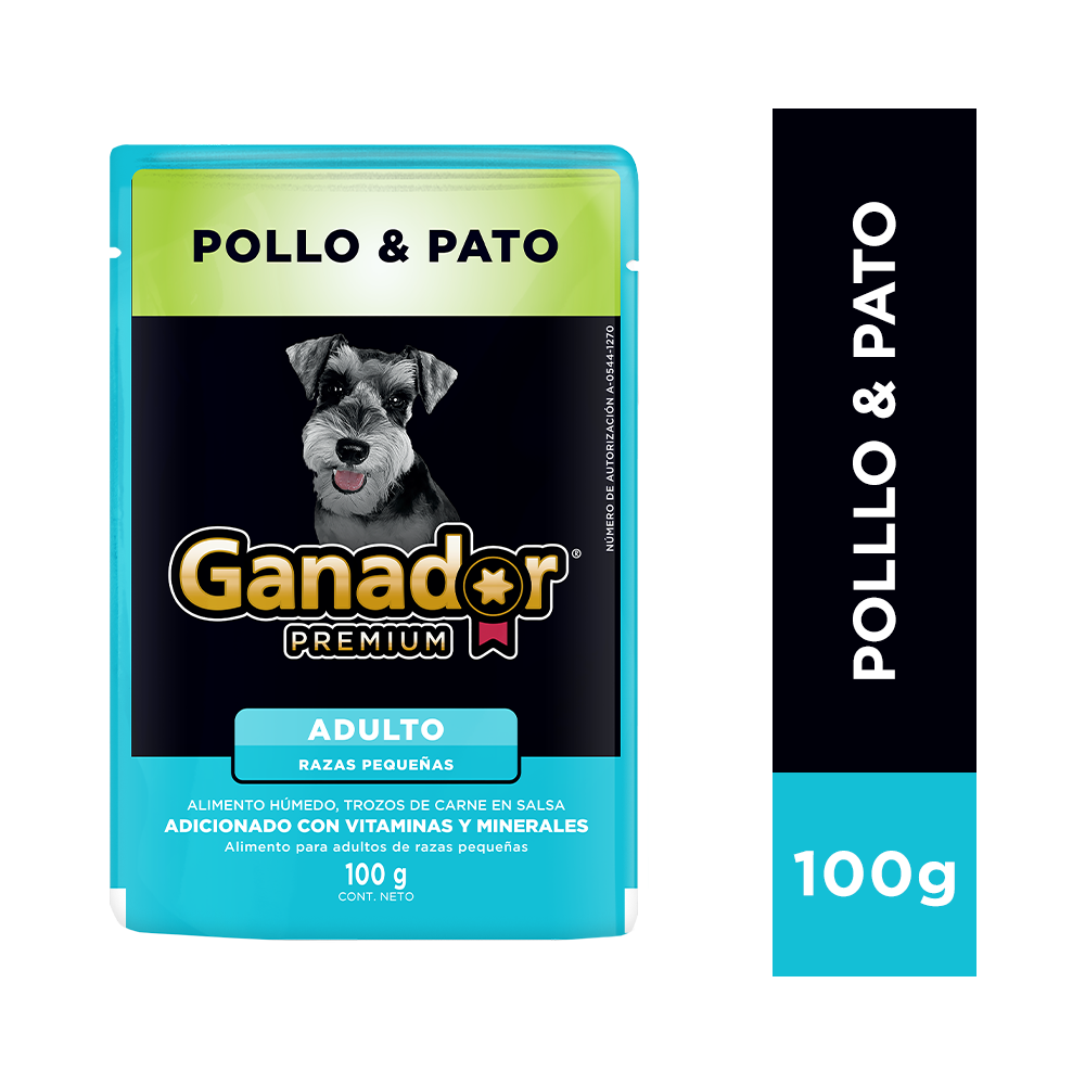Agua suficiente para el proceso, carne y subproductos (carcasas y/o pasta y/o menudencias) de cerdo y ave (pollo y/o pavo) y pollo y pato, derivados de origen vegetal, agente palatante, agentes gelificantes y/o espesantes, azúcares varios, taurina. Minerales: sulfato de cobre, manganeso, zinc, tripolifosfato de sodio, iodato de potasio, cloruro de sodio, cloruro de potasio. Vitaminas: suplementos de vitaminas E, tiamina (B1).