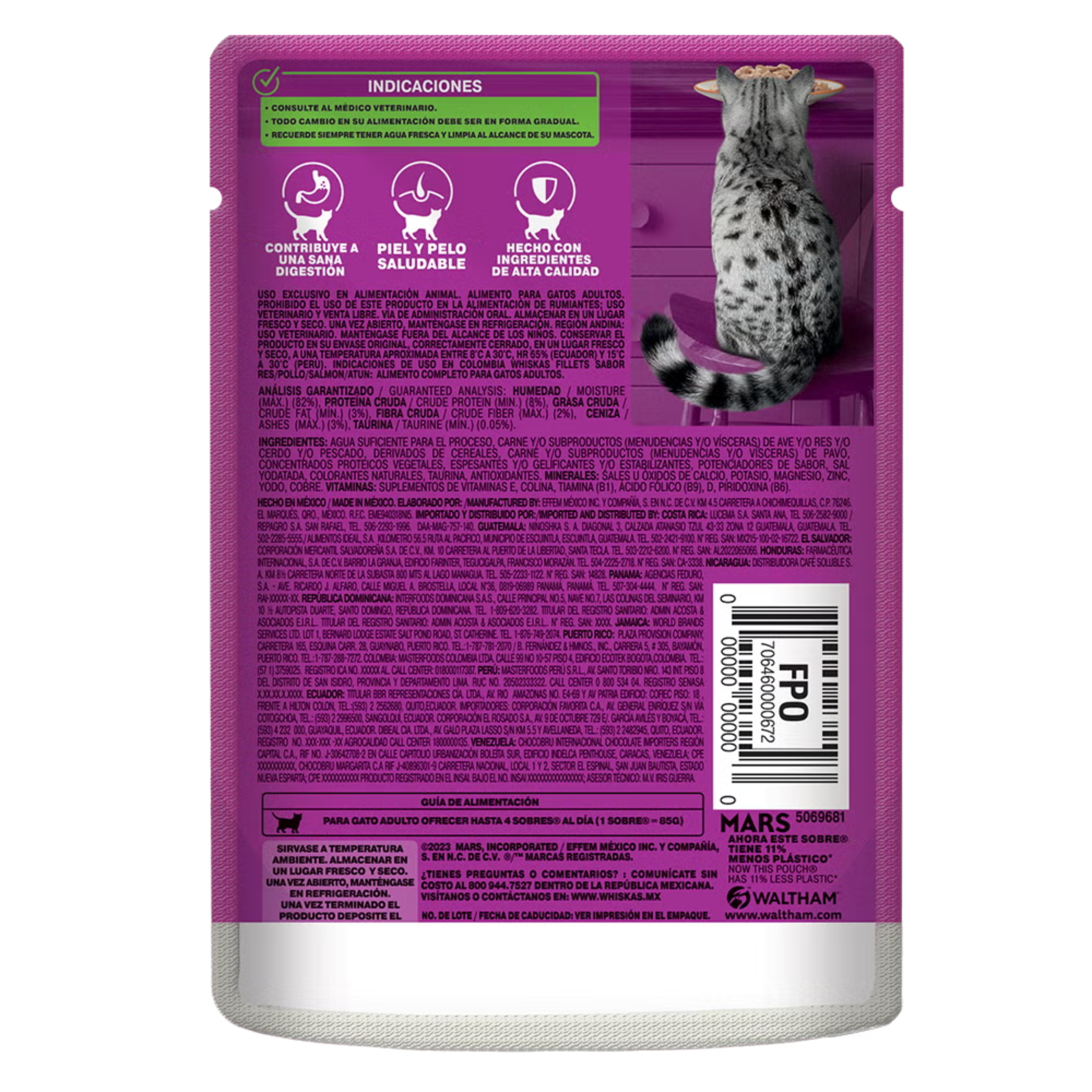 Los sobres Whiskas son trocitos de pollo cocidos al vapor encapsulados en un delicioso jelly que le otorgan el balance ideal de fibras naturales, minerales, vitaminas A y Taurina que tu gatito necesita a partir del año de nacido, es el comienzo ideal de una vida saludable. La exclusiva y revolucionaria recetas de Whiskas le ofrece a tu mascota suaves y deliciosos filetitos de pollo, encapsulados en un jelly que despertarán el instinto felino de tu gato en cada comida. Alimento 100% completo y balanceado para gatos. Recuera que todos los alimentos Whiskas son respaldados por el Centro de Investigación Waltham, líder en cuidado y nutrición de las mascotas. En cada sobre encontrarás ricos trocitos de pollo cocidos al vapor en un delicioso jelly que esta adicionado con fibras naturales, minerales, vitamina A y Taurina en un balance ideal para tu gatito; son una rica fuente de hidratación que ayuda a prevenir la formación de cálculos renales, Ideales para el consumo diario. Puedes dárselos solos o acompañados; ya que son un alimento 100% completo y balanceado pensado para gatos.